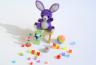 Lila Schmunzelhase (ohne Schmunzel) mit all seinen Schätzen.